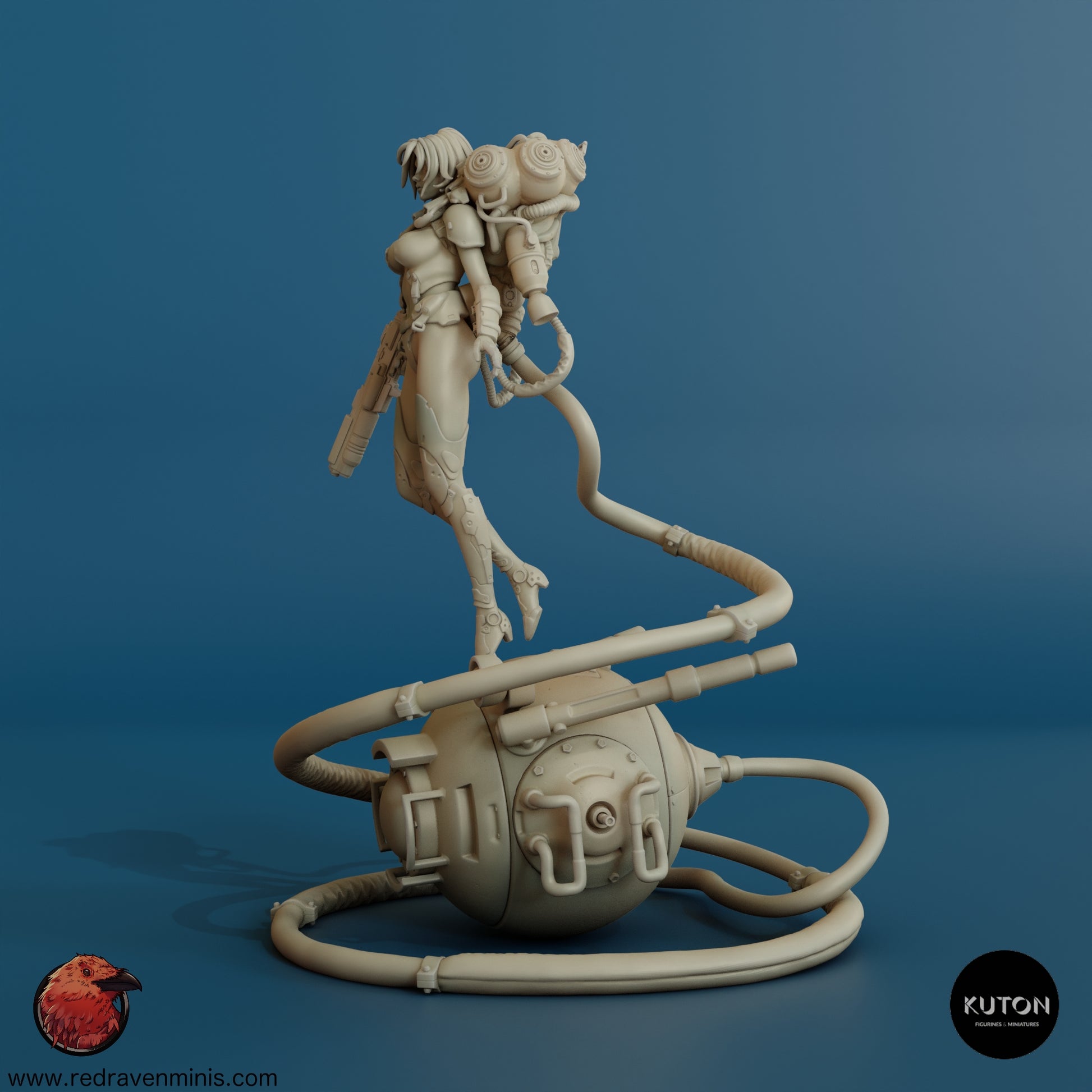 Valda - Fantasy science fiction space girl resin figure model kit. Valda comes with a detailed base which is connected to her backpack by a long hose. This model kit comes with two heads so that you can choose her preferred look.